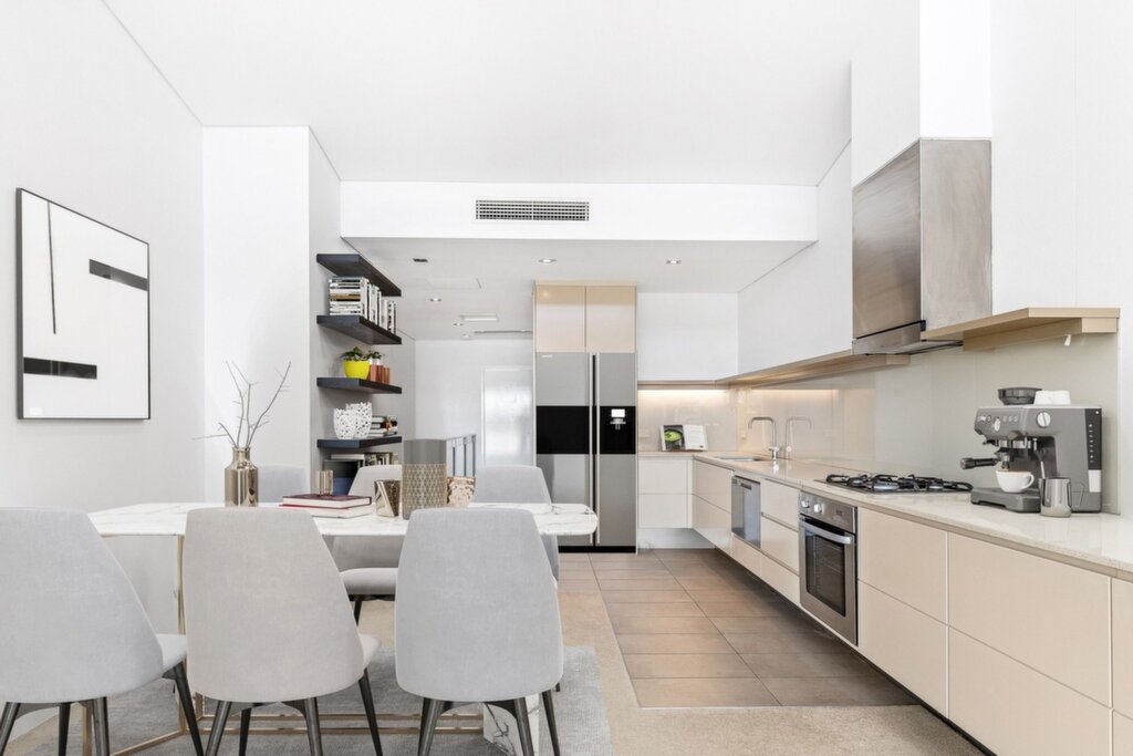 Modern kitchen with quality stainless steel appliances, gas cooking, dishwasher, and ample soft-closing cabinetry